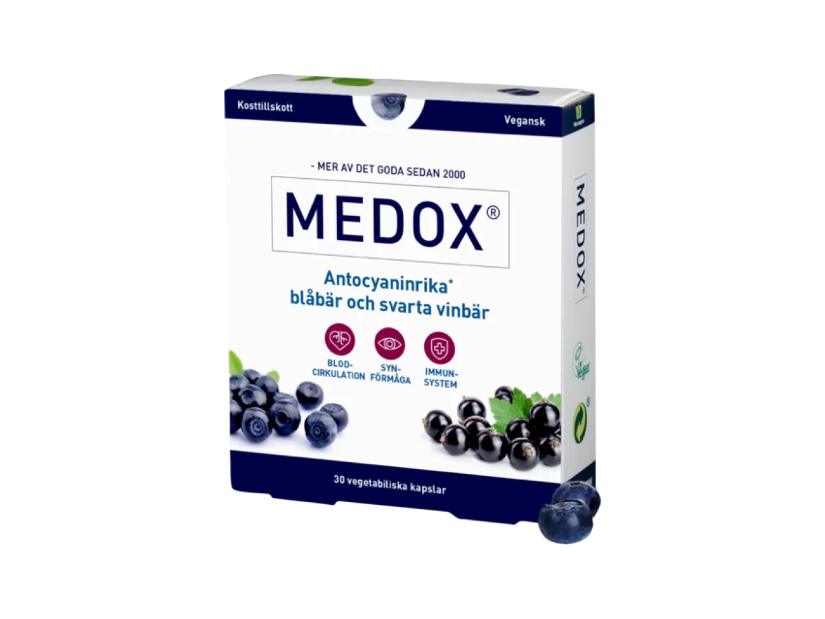 Medox är ett unikt kosttillskott producerat från naturens eget skafferi med svenska blåbär och svarta vinbär, som innehåller antocyaniner.